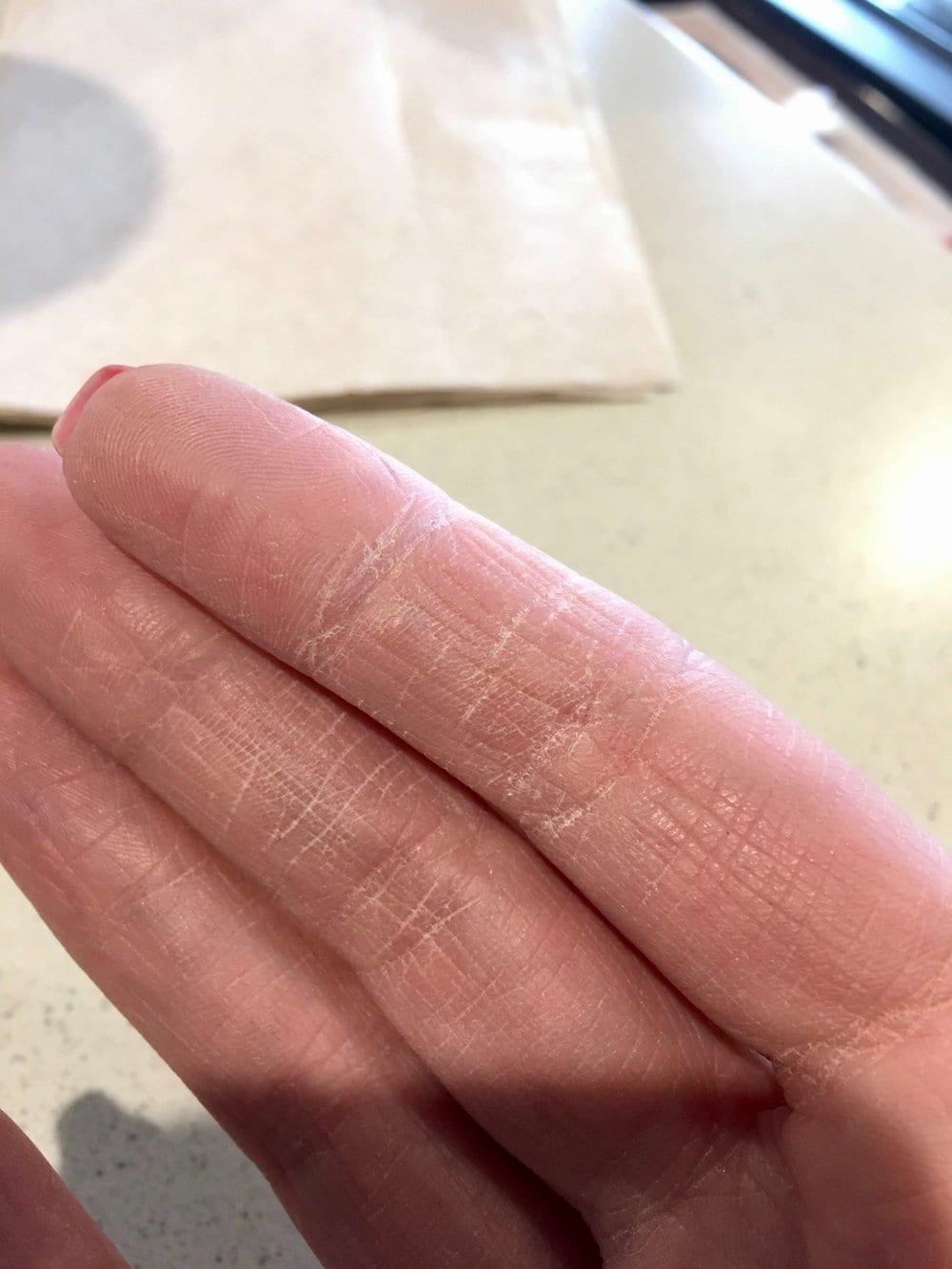 My reactions can range from severe eyelid dermatitis where my eyelids get chemical burns and the skin becomes thick and flaky (my contact lenses used to cause this as well until I discovered disposable lenses! Itʼs miserable!) to a reaction I can get on my hands. They become white and flaky. It looks similar to dry skin, but comes on intensely and does not go away with an emollient moisturizer. I also get a damaged, dehydrated skin on my face about 12-48 hours after consuming fruits or spices Iʼm allergic to and sometimes pimple-like bumps show up as well.